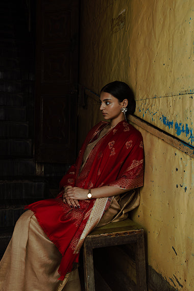 Tillaari Maroon Geometric Buti Shawl with Ornamental Border