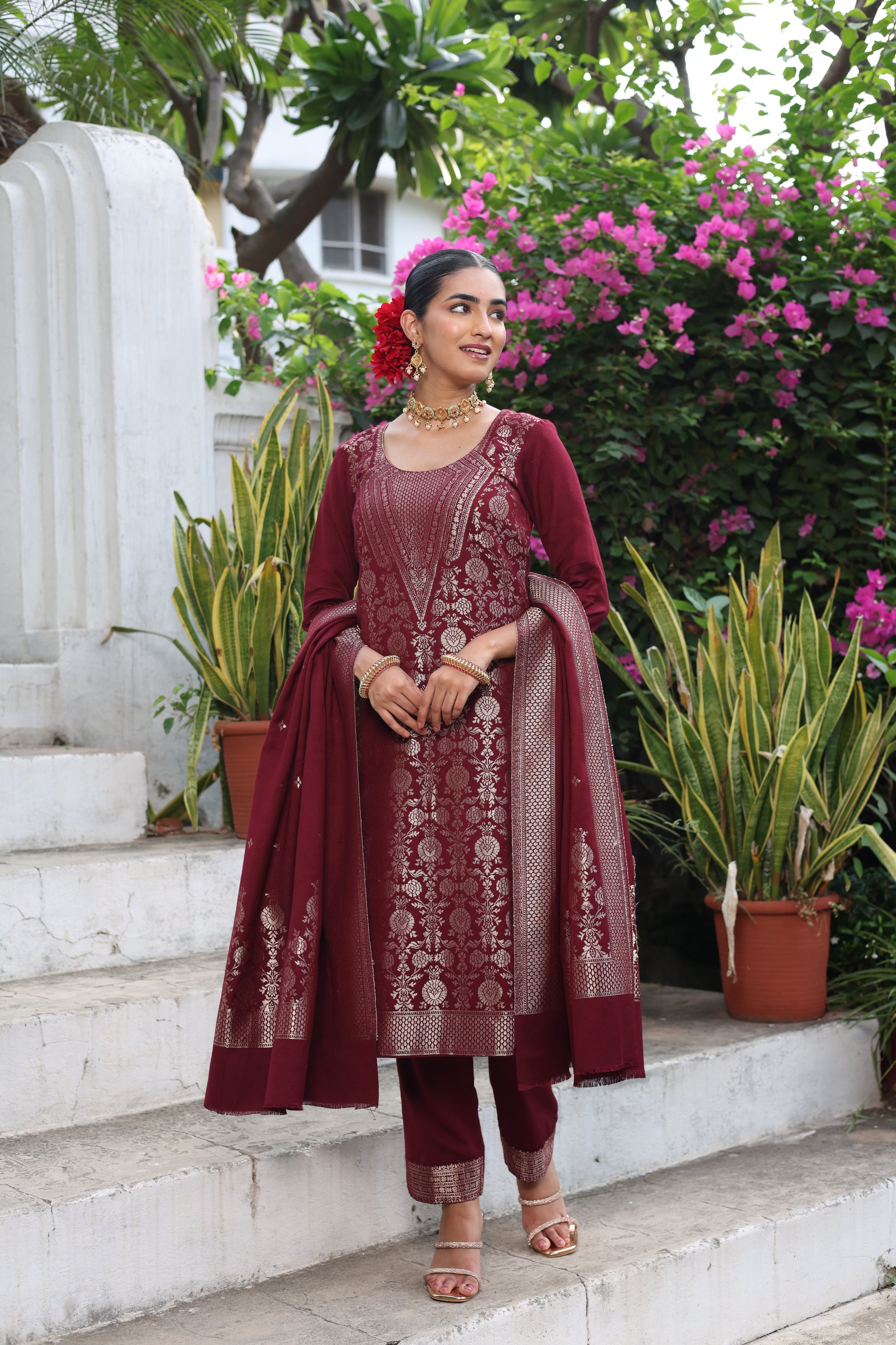 Radiate timeless charm in our Damini Wine Kurta Set, a luxurious ensemble that celebrates sophistication and traditional grace. Crafted in a deep wine hue, this outfit features intricate weaving inspired by classic floral motifs, balanced with geometric detailing along the neckline and sleeves. The flowy stole, adorned with ornate patterns and borders, completes this effortlessly elegant look- perfect for festive gatherings, weddings, or evening soirées.
