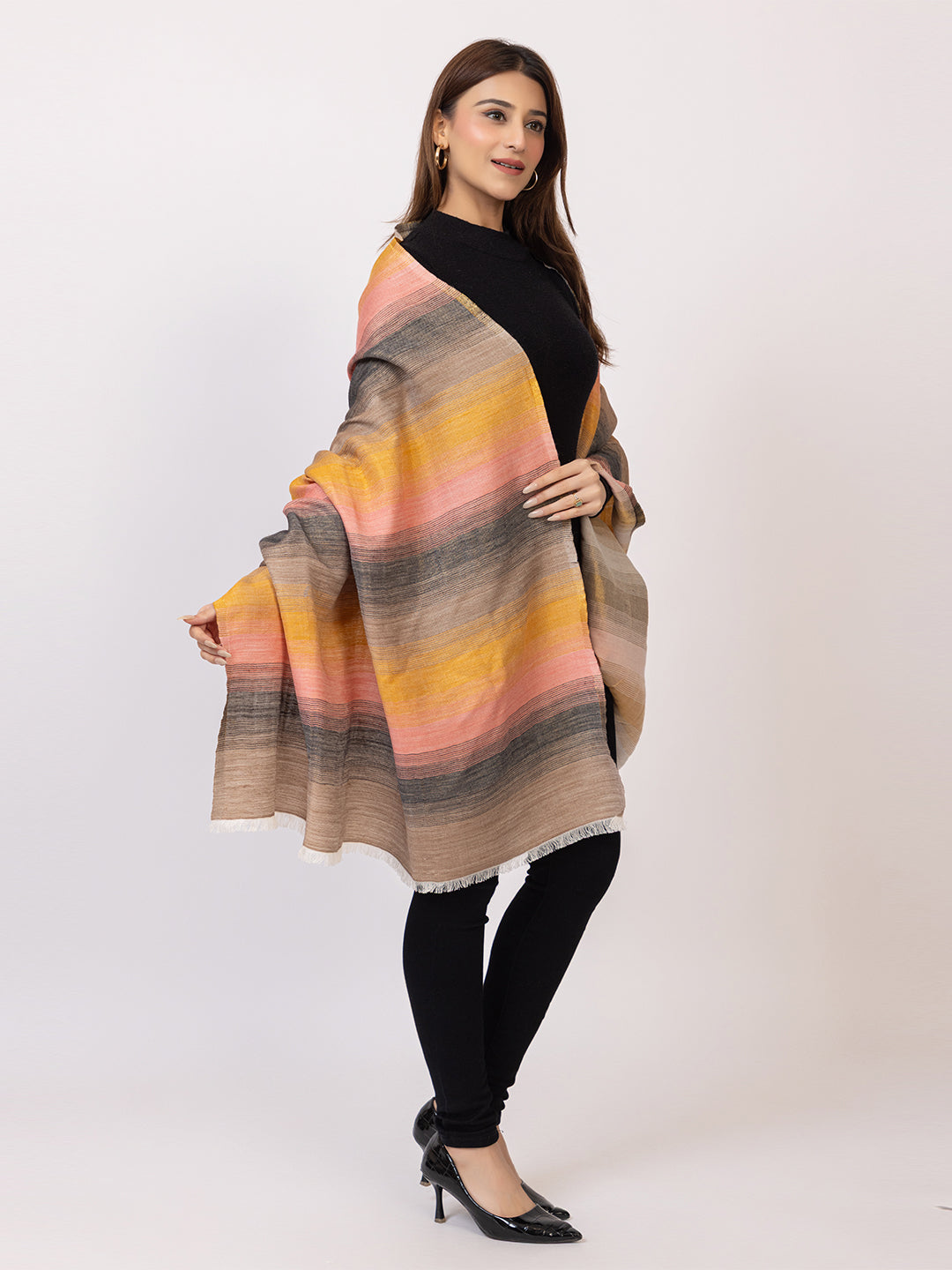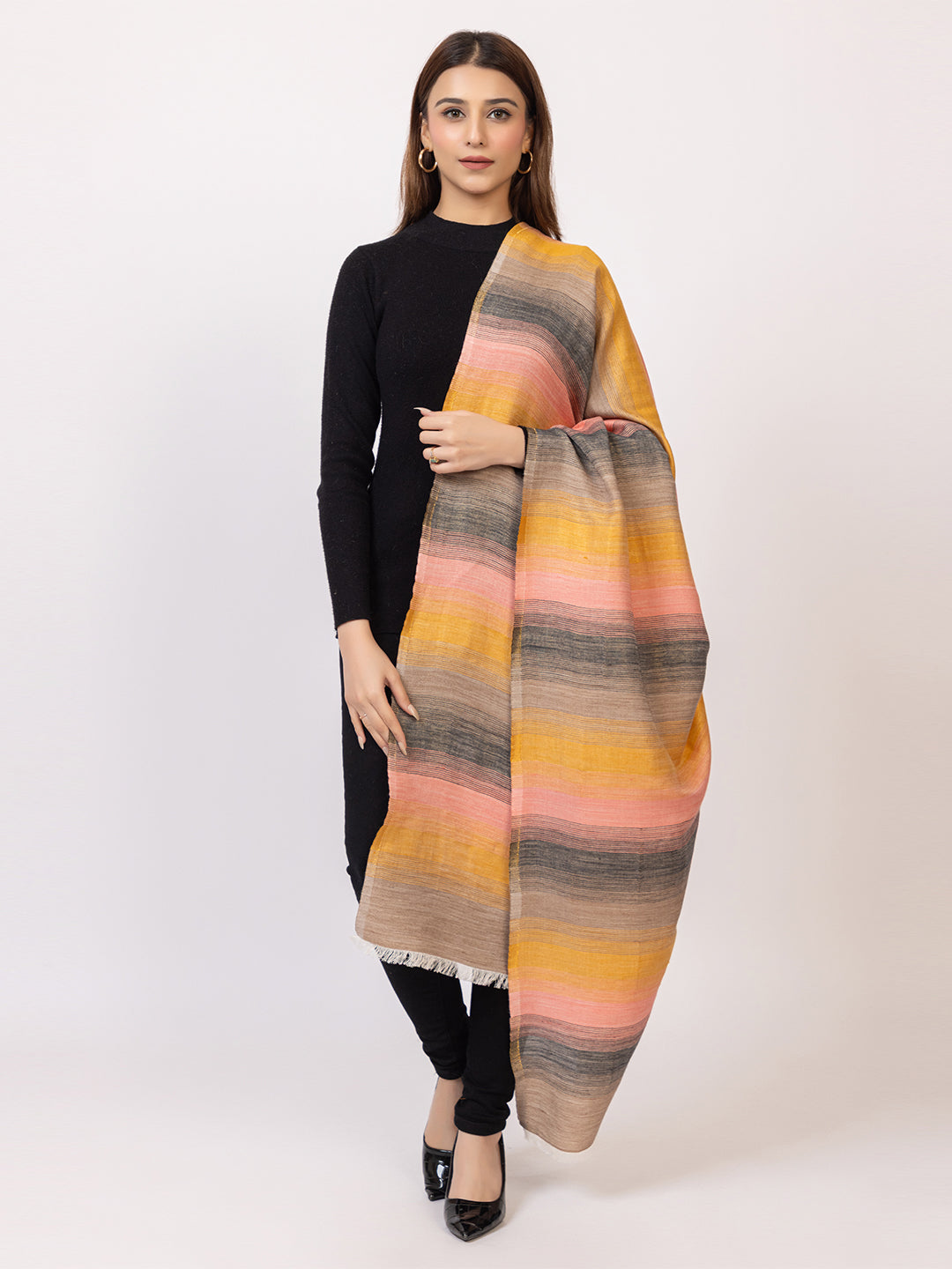 Wrap yourself in effortless sophistication with the Tillaari Pastel Multicolor Striped Shawl - a soft, ultra lightweight drape that brings together artful hues and timeless craftsmanship. Handwoven in a soothing blend of sunset pinks, misty greys, and golden yellows, this shawl captures the serene beauty of dawn skies. Its elegant gradient stripes and airy texture make it the perfect accessory for both casual and festive ensembles.